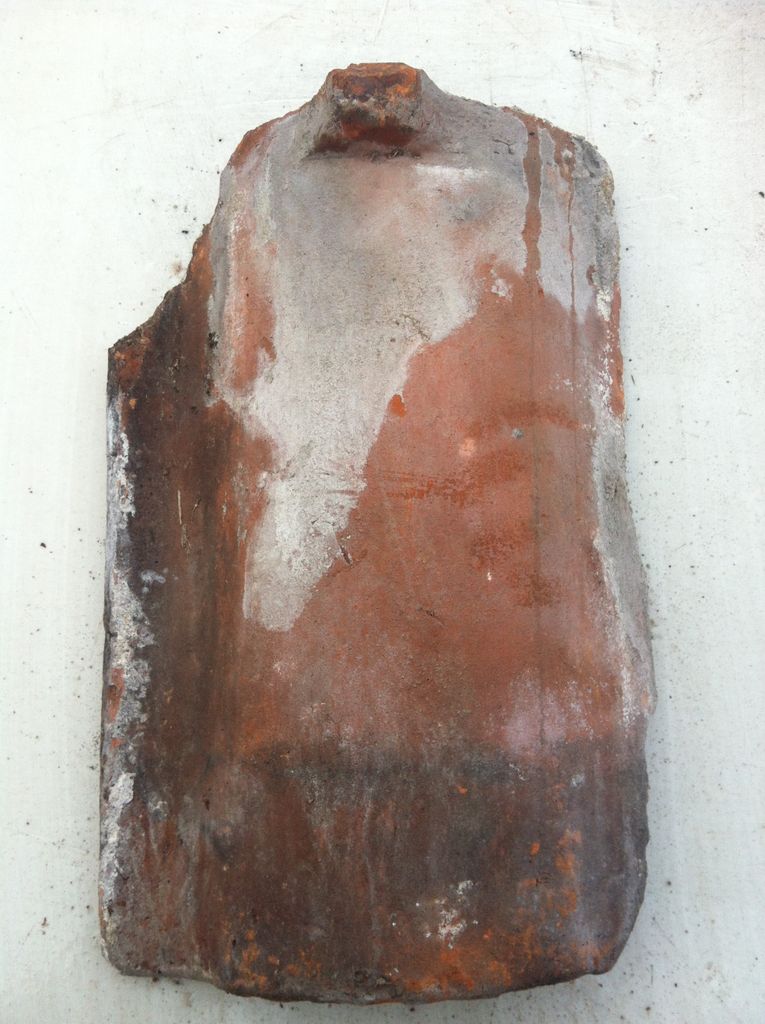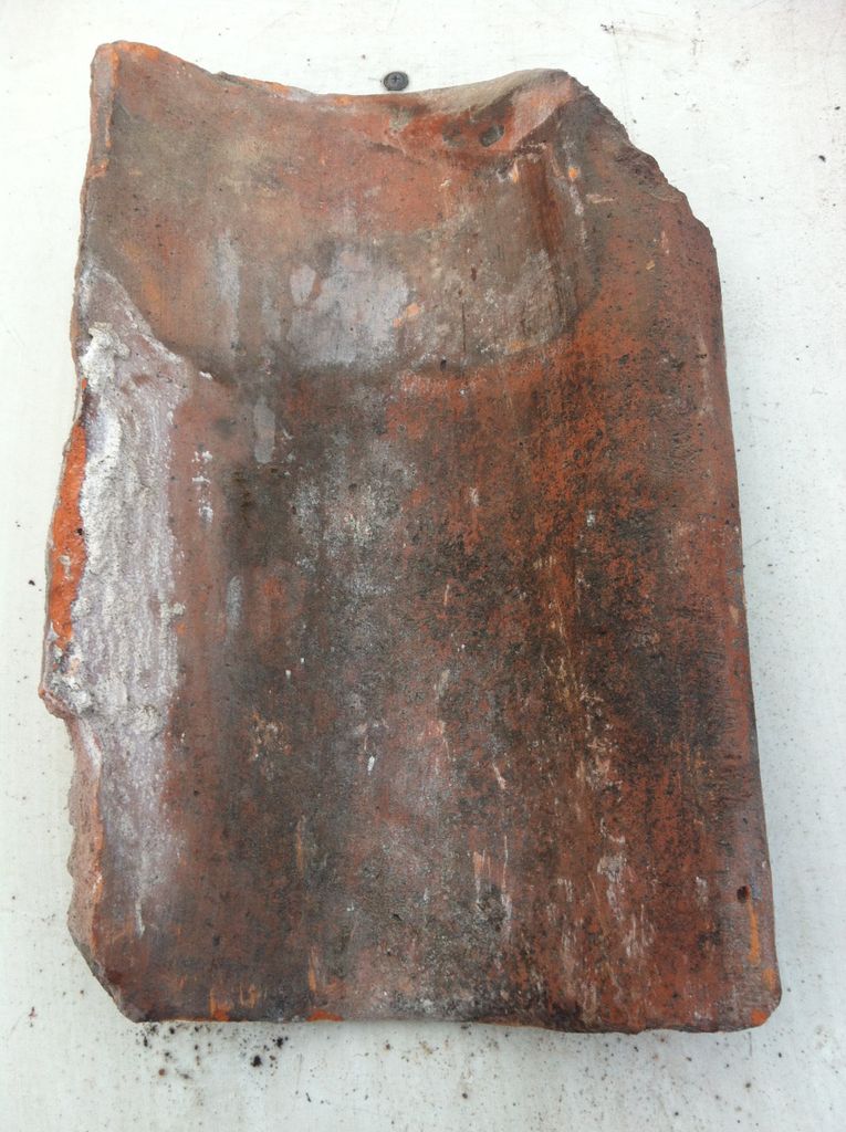 Beskrivning av Antik handslagen, 1-kupig tegelpanna Längd: 390 mm Bredd: 250 mm Höjd (dal-topp): 45 mm Klacklängd: 350 mm