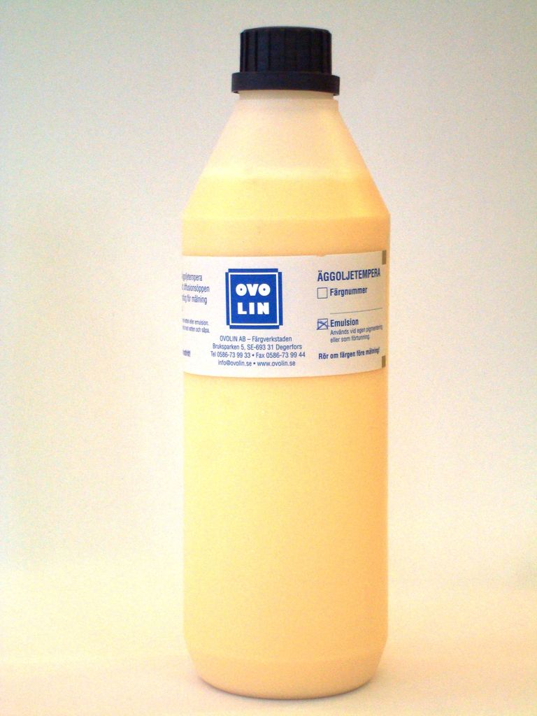 Ägg,linolja, vatten plus lite tork och konserveringsmedel.