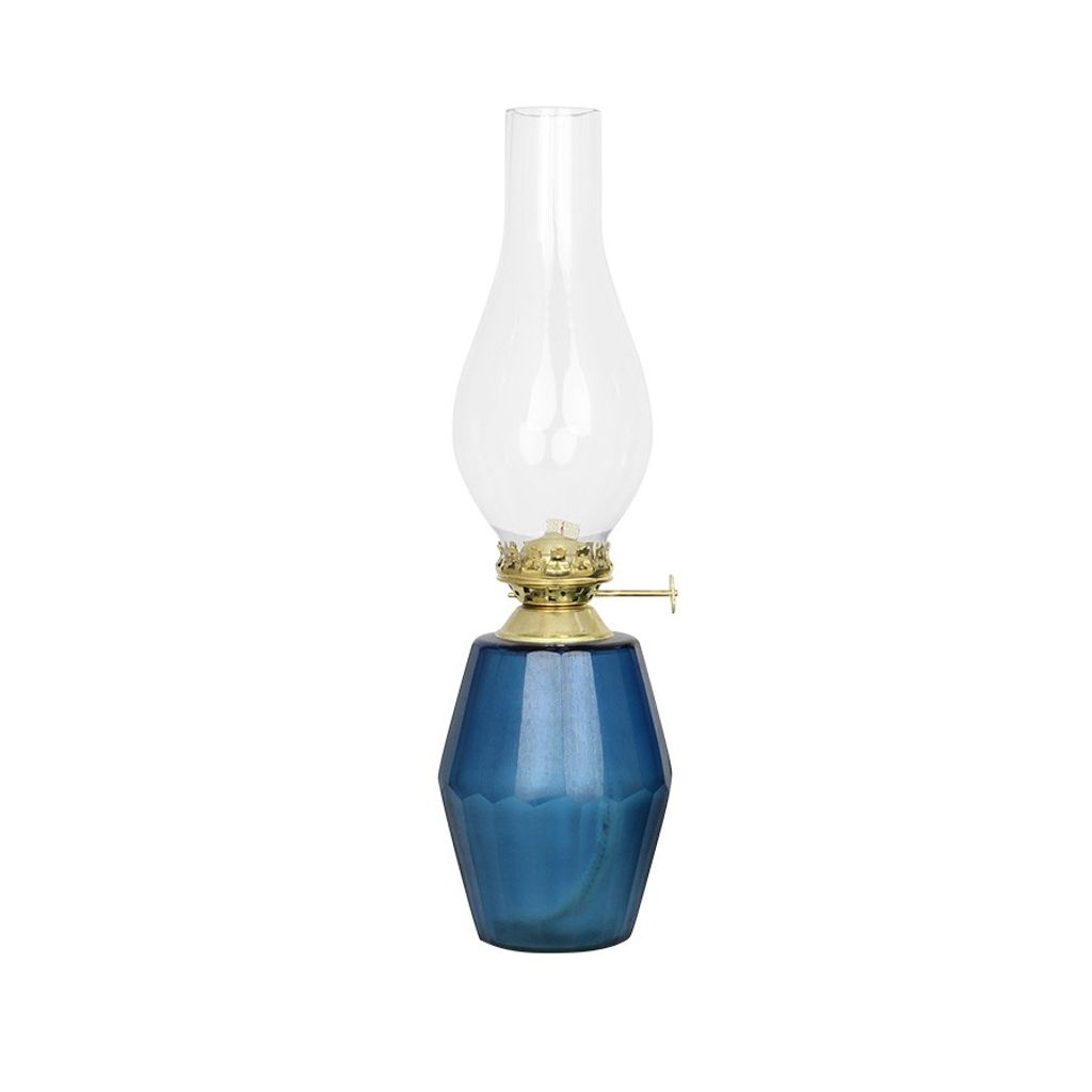<p><span class="prodSize" style="margin-bottom: 15px; display: inline-block;">Ø 7,5 x 30 cm</span><br />Fotogenlampa i frostat blått glas. Mässingfärgad brännare och brännrör i klart glas. Inklusive en veke.</p>