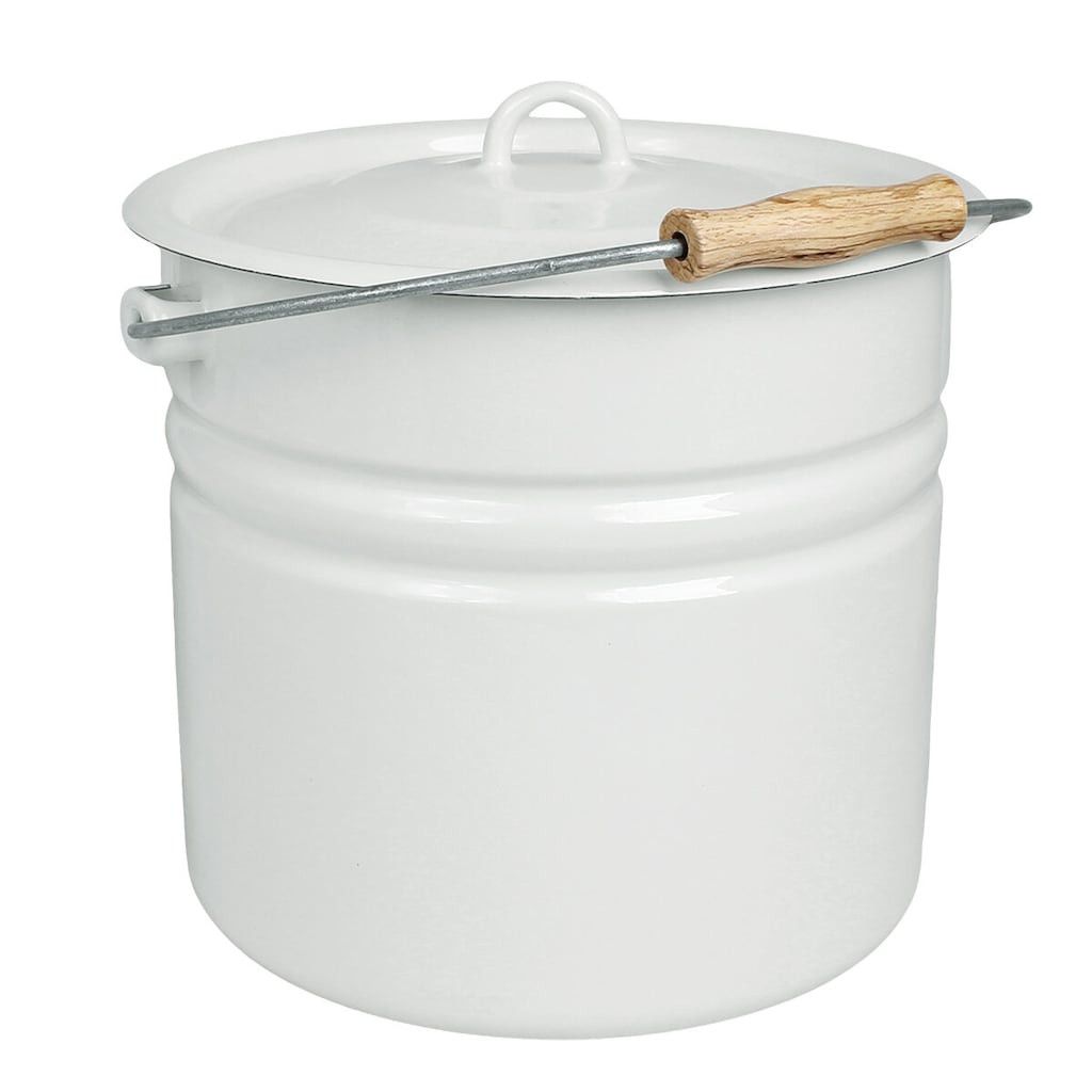 Klassisk, gammaldags hink med handtag och lock i vit emalj. Passar till kompost eller sopor, förvaring av rotfrukter och potatis, för saftning och syltning eller till vatten på torpet. En praktisk spann som passar en klassisk lantlig stil.