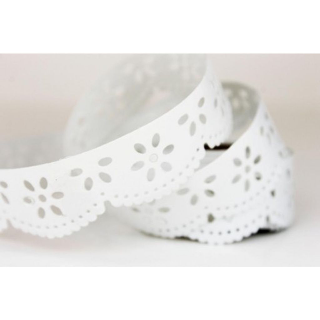 Klassisk fin hyllremsa i papper, mönster i vit spets, den är ca 2 cm bred. Varje rulle är 5 meter lång