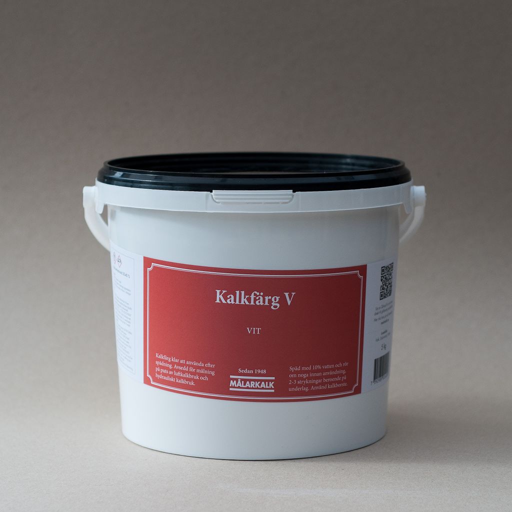 Kalkfärg V är en diffusionsöppen kalkbaserad fasadfärg som ger en lite flammig levande yta. Den har vit dolomit som fyllnadsmedel och innehåller kalk som bindemedel.