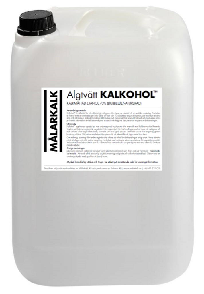 Kalkohol™ Algtvätt är framtagen speciellt för murverk och traditionella mineraliska putser, den består av 70% etanol som kalkmättats och levereras bruksklar (skall inte blandas)