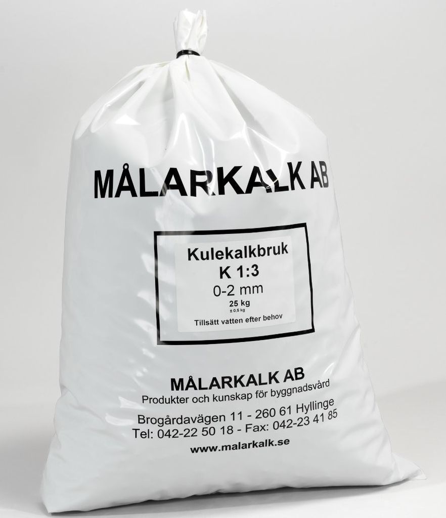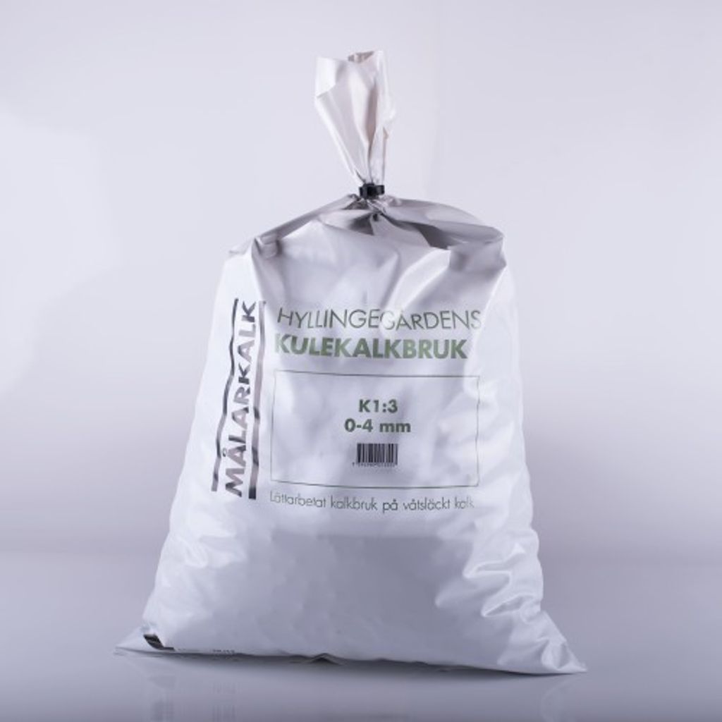 Kulekalkbruk K1:3 är tillverkad av våtsläckt och vällagrad Kulekalk, kalkvatten och välgraderad sand. Kalkbruket levereras fuktigt i plastsäck och är på så sätt helt lagringstabilt. Förvara de förslutna säckarna i ett frostfritt utrymme och plocka fram dem igen om fem eller tio år. Så länge inte luften tillåts komma i kontakt med bruket så härdar det nämligen inte! Bruket används främst inom byggnadsvården och är ett mycket lättarbetat material lämpligt för såväl omfogning, spricklagning som till hela omputsningar.