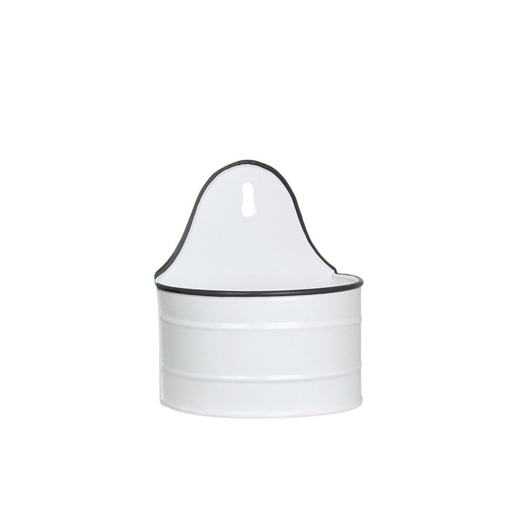Liten låda för vägg i vitlackerad plåt med grå kant. Använd för förvaring av diskborstar och rengöringsmedel i köket till exempel. Hål för upphängning. Tål ej diskmaskin.