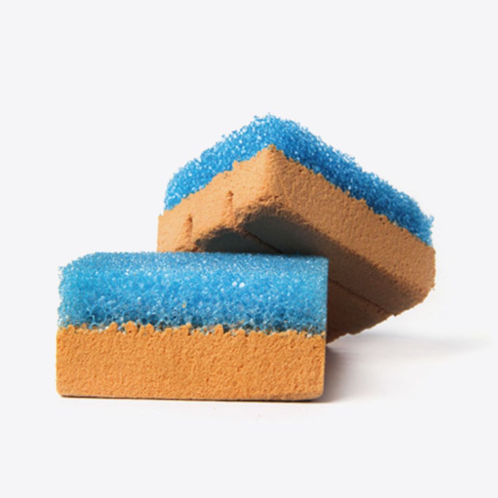 Svampen består av ett blått handgrepp och ett gult rengöringslager.