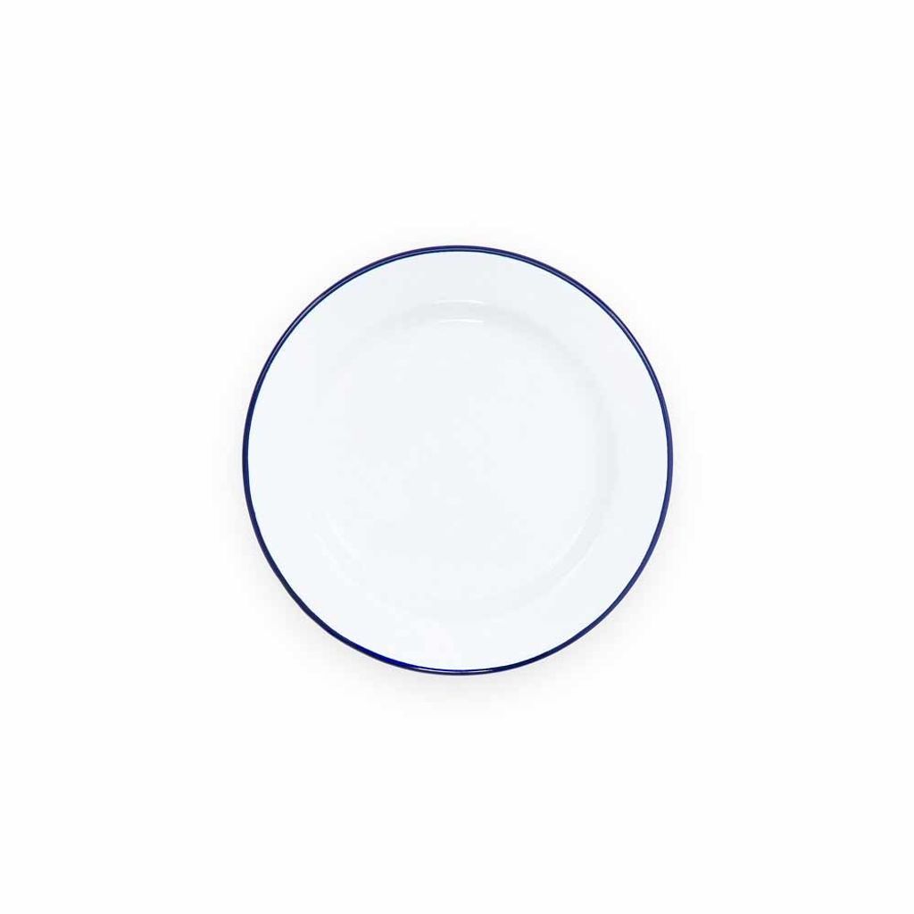 Beskrivning av Salladstallrik emalj blå <p>Emaljtallrik 21cm.</p> <p>Vit med blå kant.</p> <p>Tål maskindisk.<br />Ej microvågsugn.</p>