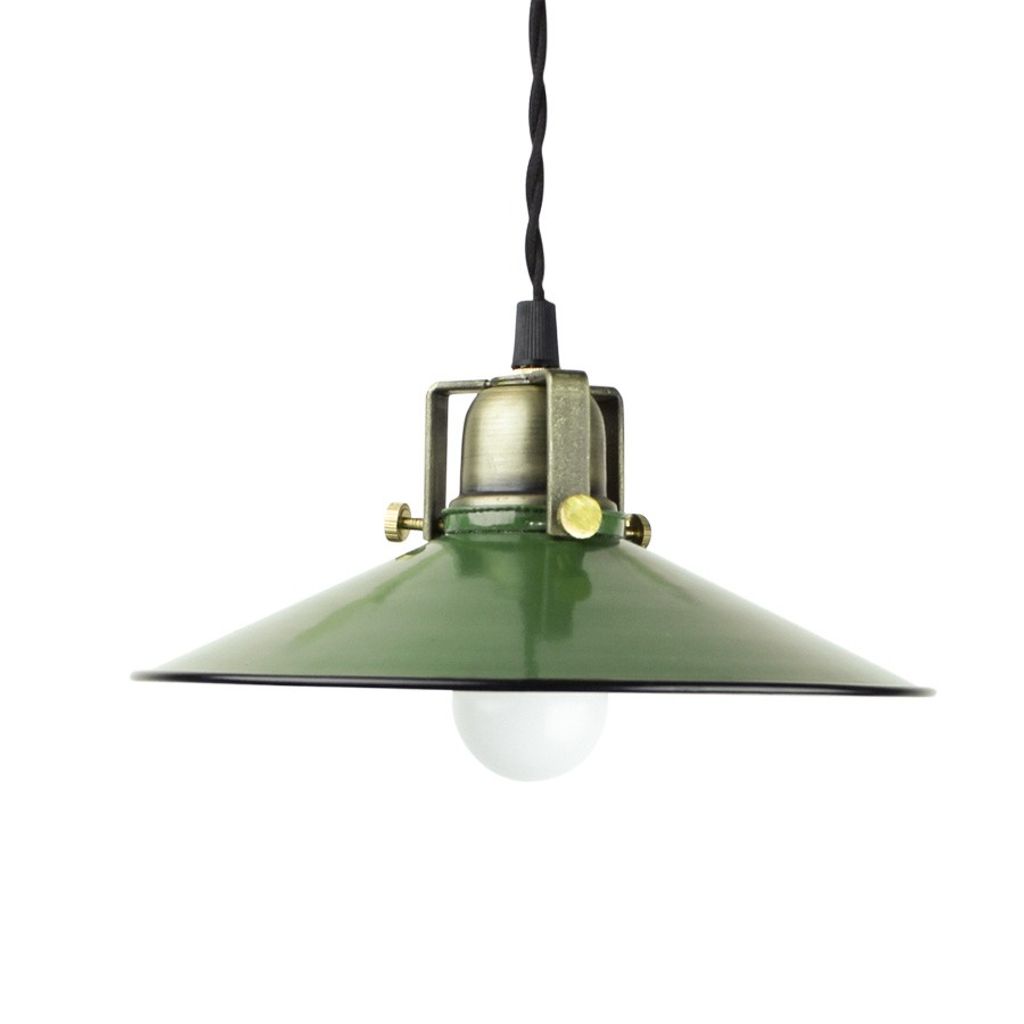 Beskrivning av Skomakarlampa Grön Emalj Passar E14, max 40 w. Lampan har en svart tvinnad textilsladd som är 1,5 meter lång, utan kontakt.