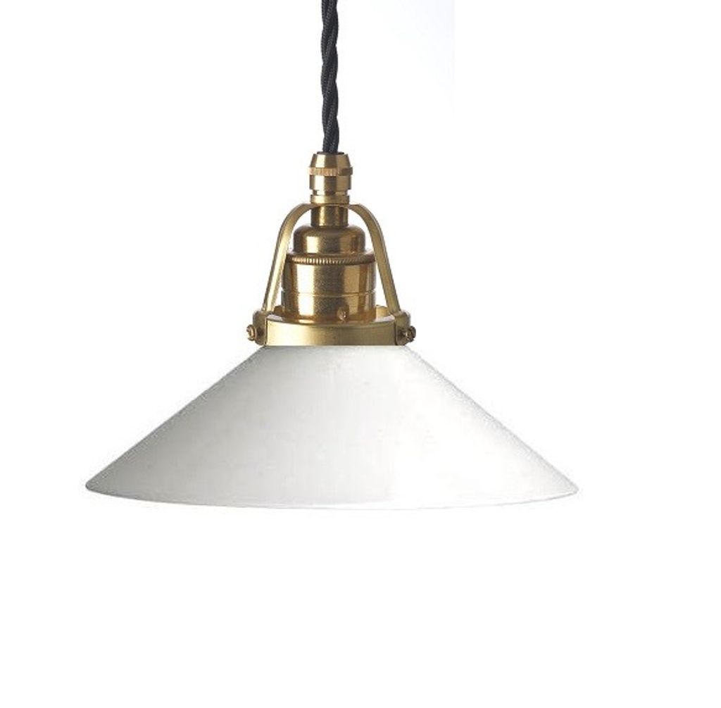 Beskrivning av Skomakarlampa, svart tvinnad sladd, 20 cm skärm MässingOpalglasHöjd: 6,5 cm2,5 m sladd 3-ledare, ingen lampkontaktSockel: E27