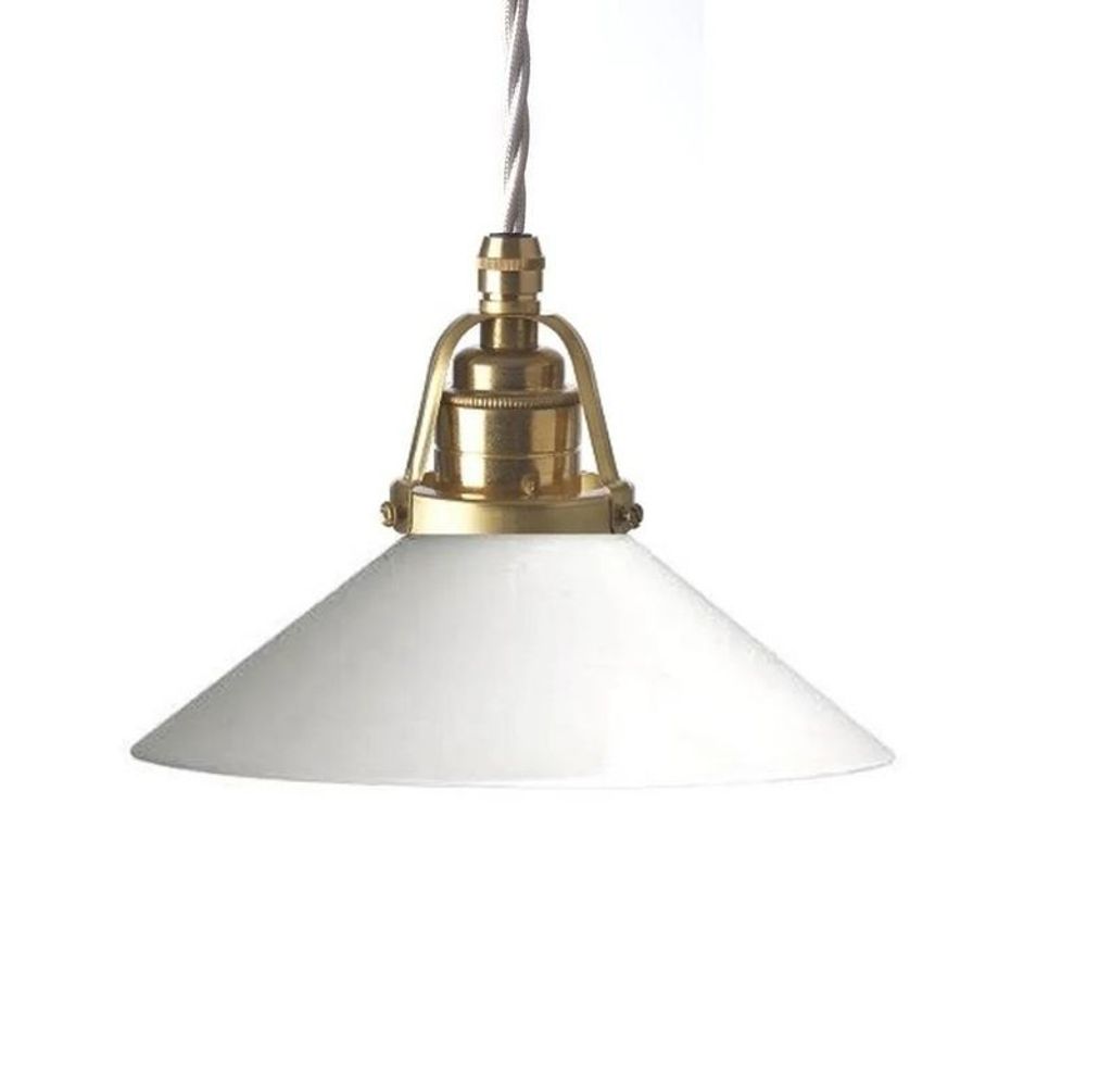Beskrivning av Skomakarlampa, vit tvinnad sladd, 20 cm skärm MässingOpalglasHöjd: 6,5 cm2,5 m sladd 3-ledare, ingen lampkontaktSockel: E27
