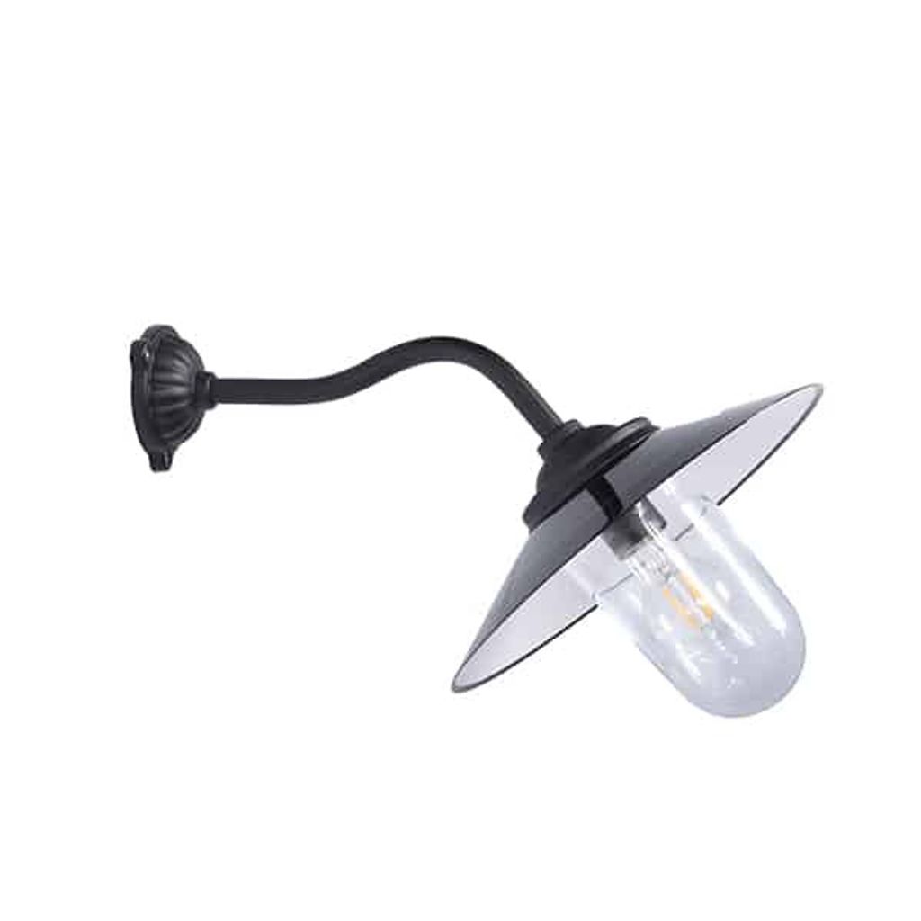 Stallykta gjutjärn med skärm av emalj med svart ovansida och vit undersida. Tillverkad efter gammal förlaga från 1900 talet. Vanlig utomhuslampa i Sverige och Europa under denna tidsperiod.