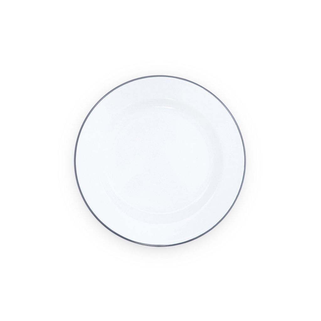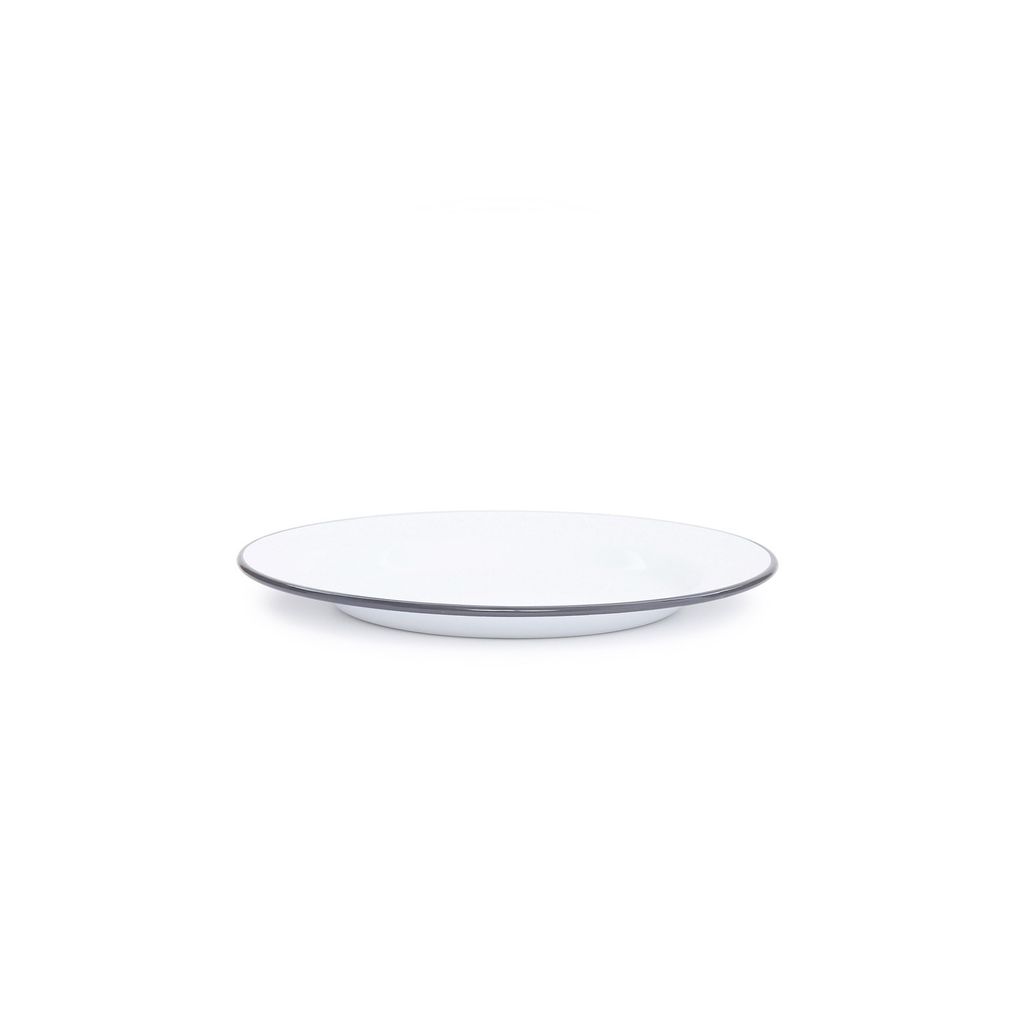 Beskrivning av Tallrik emalj grå <p>Emaljtallrik 26cm.</p> <p>Vit med grå kant.</p> <p>Tål maskindisk.<br />Ej microvågsugn.</p>