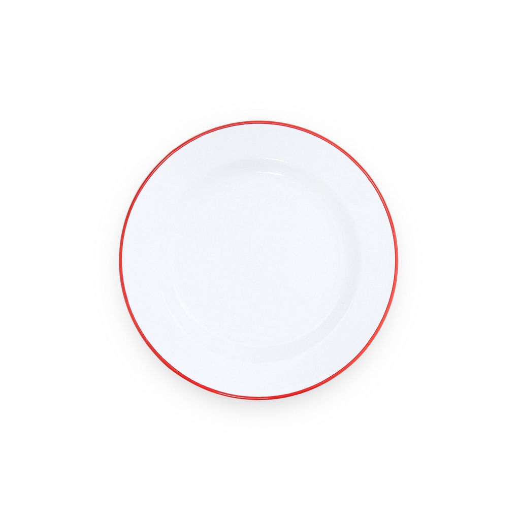 Beskrivning av Tallrik emalj röd <p>Emaljtallrik 26cm.</p> <p>Vit med röd kant.</p> <p>Tål maskindisk.<br />Ej microvågsugn.</p>