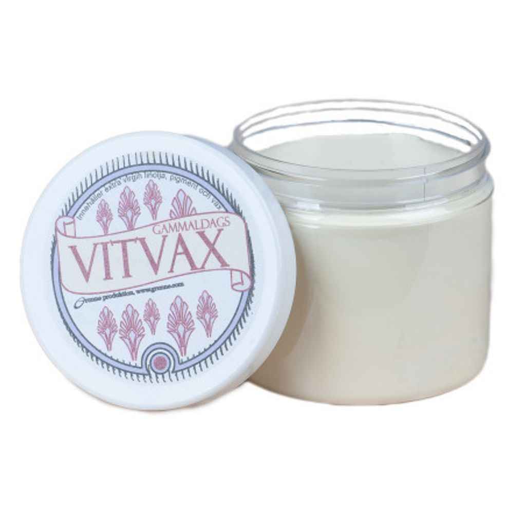 Vit vax på natruliga oljor och vaxer helt fritt från lösningsmedel. Vaxen är mycket bra för behandling av trärena ytor som ex. köksbänkar, bord m.m. Vaxen läggs på med trasa och överflöd torkas direkt av, sedan efterpolerar man till önskad finish. Vitvax ljusar upp trä såsom björk, ask, gran och fur mfl Trasor som använts ska blötas pgr av brandrisken eftersom linolja ingår i produkten.